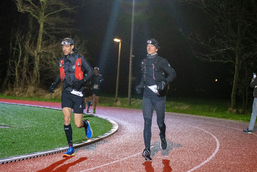 Om 04.30 lopen we naar buiten vanuit de kantine van de atletiekbaan. Binnen heb ik kort gesproken met een aantal jongens met een drone, zij volgen vandaag Jeroen van Veen, één van de deelnemers en tevens sponsorloper die geld inzamelt voor het Prinses Maxima Centrum. De banaan is op en de sportdrank ook dus het hele ritueel zit erop en ik ben klaar voor de start. Om 04.35 dan het startschot, ik start in korte broek, met mijn (nieuwe) enkel tubes, t-shirt (merino), regenjack, waterdichte handschoenen die ik woensdagavond nog in allerijl online besteld heb, en petje. Wat aan te trekken was nog een flinke vraag, want met dit weer is het moeilijk inschatten wat verstandig is. Tera heb ik een tas gegeven met droge shirts, sokken etc. Voor nu hoop ik vooral dat mijn kern warm genoeg blijft. Gelukkig is het tot dusver droog.