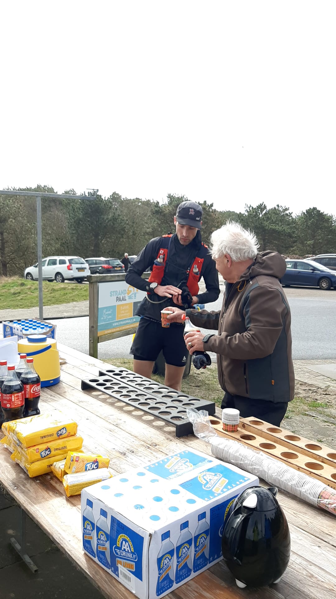 Op het stuk terug richting de Hors loopt Bram weg. Hij zal de wedstrijd uiteindelijk winnen en ik zie hem dan ook niet meer terug. Werner is nog altijd in de buurt en samen beginnen we aan het stuk strand. Echter, sinds een stukje voor het keerpunt ben ik mij al iets minder gaan voelen. Dat is nu nog steeds zo. Ik hoop maar dat ik erdoorheen kom. Er zit vaker wel een mindere fase in een lange race, dat kan ook weer overgaan. Gewoon doorgaan dus. Het strand is flink ploeteren en de tempo’s lopen dan aardig op. Het hele stuk loop ik achter Werner. Daar voel ik mij gezien de harde wind best een beetje lullig over, maar bij het afgaan van het strand zeg hem ook dat ik hem ga laten gaan. Helaas. Ik wens hem succes en na de strandafgang stop ik met lopen. De eerste bemande post die we tegenkomen, en ik wil cola en wat zouts. Ik neem nog een tweede kopje van de helden die ook met dit weer daar staan en begin voorzichtig weer te lopen.