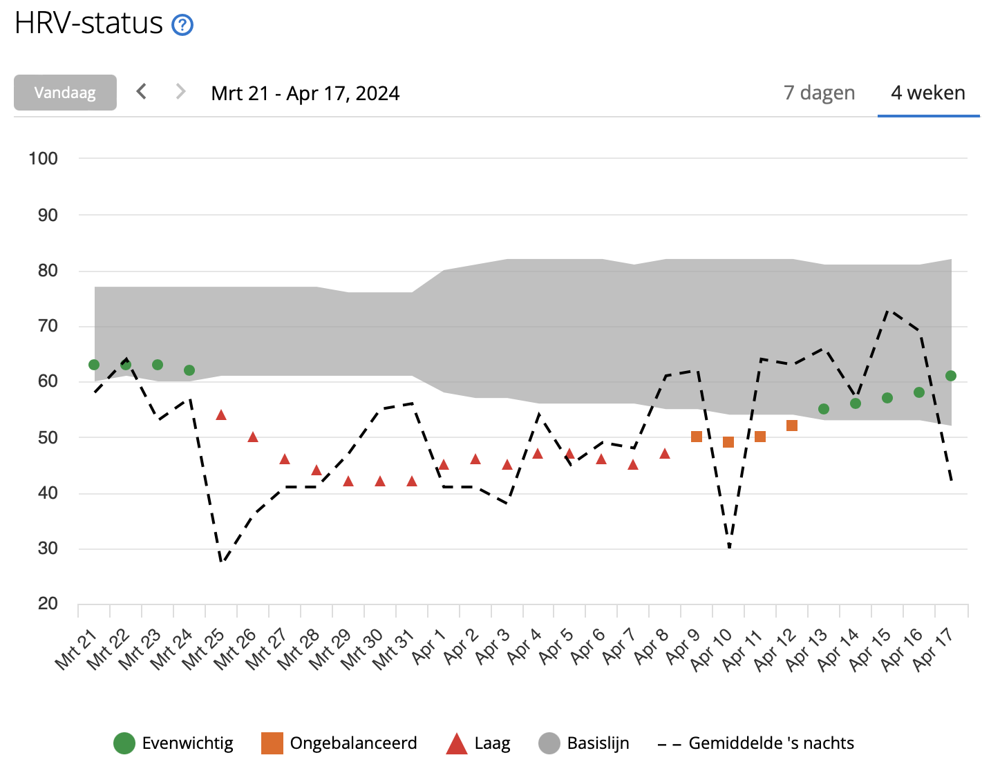De spierpijn blijft lang hangen. In totaal zo’n anderhalve week. Natuurlijk wordt deze steeds minder, maar hardlopen zit er echt nog niet in. Na anderhalve week kan ik weer een rustig herstelloopje doen. De eerste gaat nog heel moeizaam, maar de tweede alweer een stuk beter. Al merk ik wel dat ik nogsteeds vermoeid ben. De rusthartslag blijft ook en ook mijn HRV blijft ondermaats. Pas na twee weken begint de HRV weer op peil te komen en voel ik ook weer kracht terugkeren in mijn benen. Dat geeft wel een goed gevoel, want was even bang dat het weg zou blijven. Echter, na een paar dagen toch ook weer een griepje te pakken. Valt ook terug te zien aan een flinke dip in de HRV ’s nachts. Wellicht is de weerstand toch nog iets verzwakt? Of gewoon pech? Gelukkig gaat het herstel hiervan snel en voel ik mij hierna weer zoals voorheen. Er komt zelfs een beetje zin om te lopen terug.