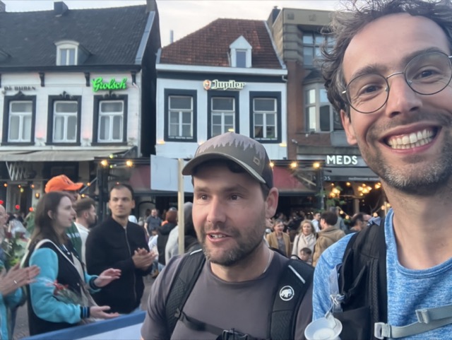 Een stuk kersenvlaai dat wordt uitgereikt in Maaseik doet de de gemoederen goed. Ik zie Paul helemaal opfleuren en hij vraagt mij waarom ik maar zo’n klein stukje heb gepakt. Maar ik was zelf ook al aan het kijken voor een groot stuk, hij heeft zelf gewoon de allergrootste punt meegenomen. Daar ben ik ook wel blij mee, want in de krentenbollen die ik hem tot zijn ongenoegen blijf aanbieden had hij echt geen zin meer.
